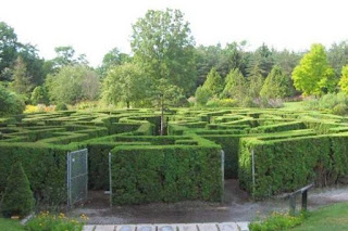 There is an opening in the wall of shrubbery to enter and follow the path as we find the way to the center.